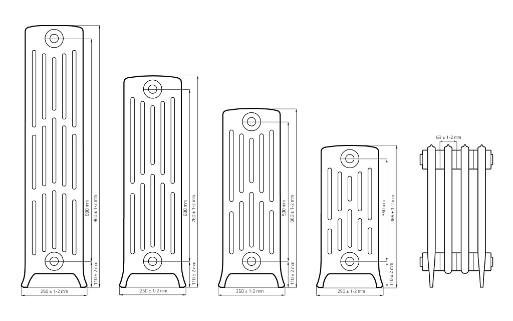 Все данные размеров радиаторов являются приблизительным, так как в литье допустимы небольшие отклонения, поэтому мы рекомендуем производить вывод и подключение труб только при наличии радиаторов на стройплощадке.