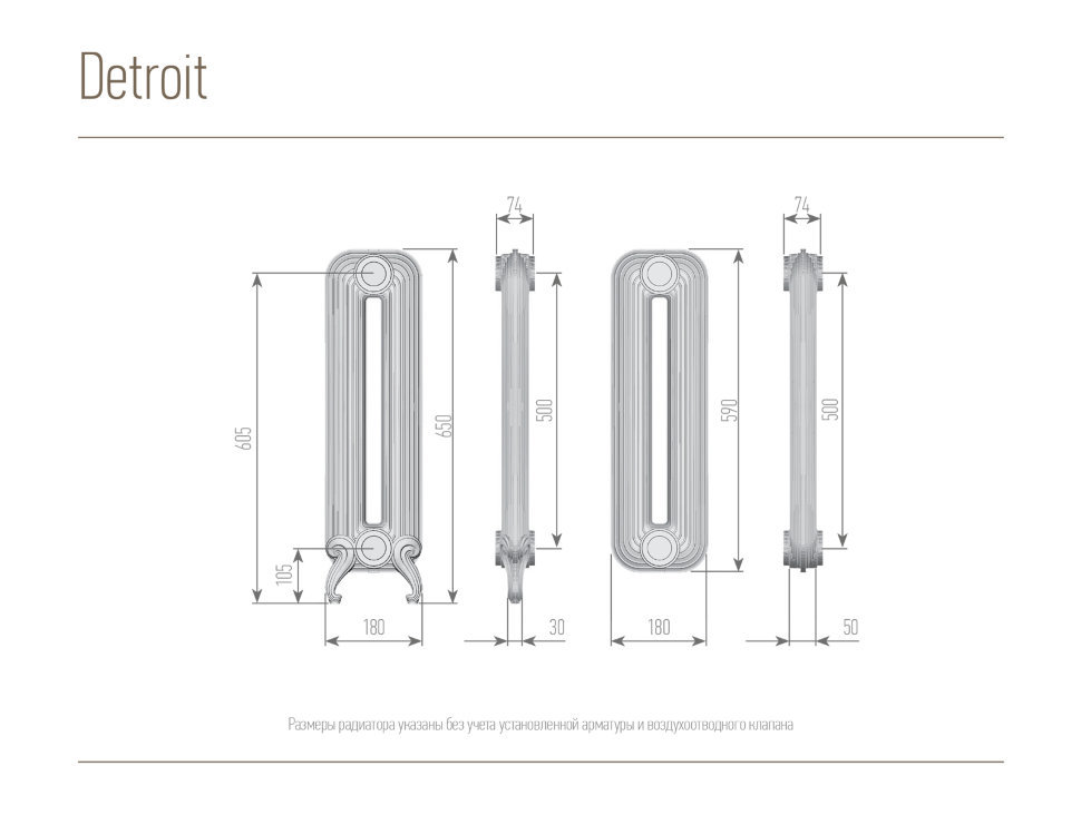 Чугунный радиатор EXEMET Detroit - напольные радиаторы отопления с рельефной поверхностью секций, идеально подойдут как для современных, так и для классических интерьеров. МодельDetroit может быть выполнена в различных цветовых решениях, что позволяет сделать данный радиатор достойным элементом самого сложногоинтерьера. Используя традиционные методы литья, EXEMET Detroit являются вдохновляющей коллекцией, которая перекликается с периодом влияния рококо. Практичные и стильные, чугунные радиаторы предназначены для современнойжизни, сумев сохранить очарование былых времен. Особенность чугунных радиаторов в том, что они имеют самый большой срок эксплуатации - более 50 лет! Именно эти характеристики делают чугунные радиаторы прекрасным решением для организации систем отопления в домах, офисах и квартирах.