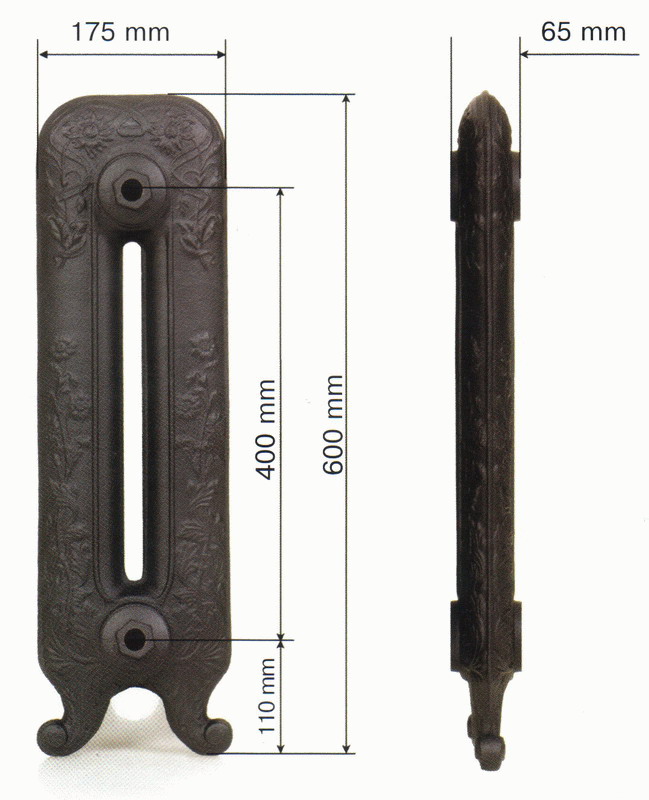 Чугунные радиаторы отопления Diana изготовлены на основе моделей радиаторов, которые появились во Франции в 1890 году. То есть в тот период, когда стиль модерн стал доминировать в Европе. Богатый и очень красивый чугунный радиатор с выраженным рисунком из цветов, которые отчётливо видны во всех окрасах придает особенную атмосферу помещению. Любители классики высоко оценят изысканность и надежность радиатора Diana. Стандартный окрас радиатора - матовый черный. Его полная высота составляет 600 мм, что позволяет использовать радиатор как в типовых квартирах, так и в загородных домах. Немецкие чугунные радиаторы являются одним из признаков благополучия и достатка в доме, а также идеально дополняют классический интерьер. Качество покраски радиаторов выполнено по самым высоким стандартам дизайна. Поэтому GuRaTec Diana так любимы всеми дизайнерами интерьеров. Все данные размеров радиаторов является приблизительным, так как в литье допустимы небольшие отклонения, поэтому мы рекомендуем производить вывод и подключение труб только при наличии радиаторов на стройплощадке.
