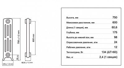 - Теплоотдача, Вт (при t=60 град;С):134