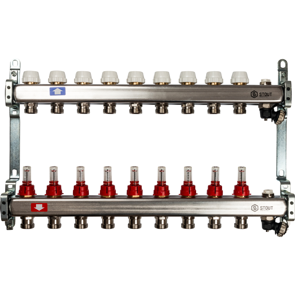 Stout Коллектор с запорными клапанами под электротермоприводы 9 контуров (с расходомерами)