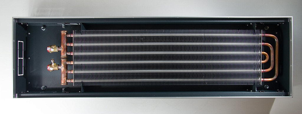 Теплообменник выполнен из цельной медной трубы диаметром 12 мм (у конвекторов глубиной 65, 85 и 120 мм) или 16 мм (у конвекторов глубиной 105 и 140 мм). Ламели теплообменника изготовлены из алюминиевых пластин толщиной 0,22 мм, соединение с трубой выполнено дорнованием.