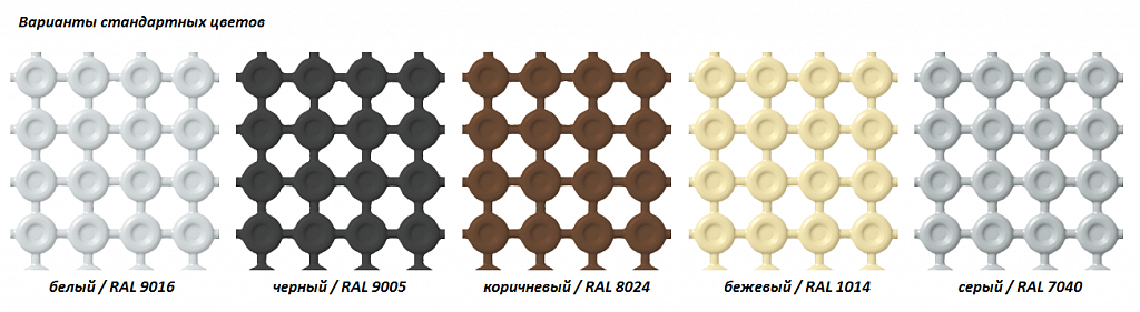 Цвет - RAL 9016 (белый), RAL 9005 (черный), RAL 8024 (коричневый), RAL 1014 (бежевый), RAL 7040 (серый)