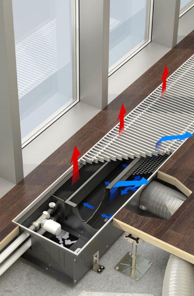 Встраиваемый в пол конвектор с естественной конвекцией Varmann Ntherm Air - это готовый к монтажу отопительный прибор, предназначенный для изоляции от холодного воздуха больших, доходящих до пола окон, а так же встраивания в подоконник. Конструкцией конвектора предусмотрен подвод приточного воздуха от системы вентиляции и равномерном распределение его в воздухораздающем модуле по все длине конвектора. Имеется возможность регулирования подачи воздуха на теплообменник конвектора шиберной заслонкой. Возможна работа конвектора Ntherm Air в системе холодоснабжения с возможностью дренажа конденсата.