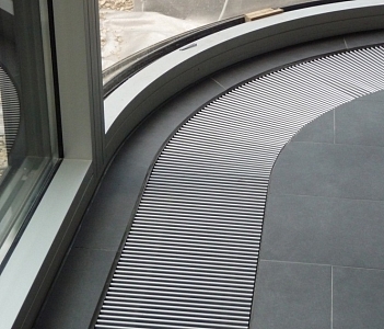 - декоративная рамка по периметру жёлоба из алюминия U-образного, либо F-образного профиля, выполненная в цвет решетки, с черной полосой из пористой резины в месте контакта с решеткой;
