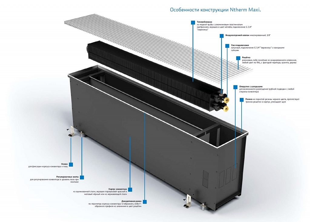 Встраиваемые в пол конвекторы с естественной конвекцией Ntherm Maxi предназначены для изоляции от холодного воздуха больших, доходящих до пола окон, а так же встраивания в подоконник. Конвекторы Ntherm Maxi характеризуются высокой теплопроизводительностью и используются в помещениях, где необходимо подать в зону остекления большое количество тепла, но нельзя использовать конвекторы с принудительной конвекцией. В конструкции конвектора Ntherm Maxi используется эффект повышения тепловой мощности, с увеличением направляющих теплообменника, и, соответственно, увеличением высоты корпуса конвектора.