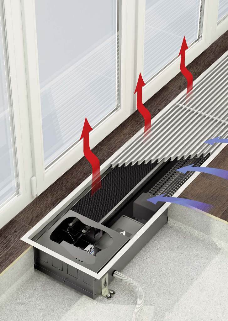 Встраиваемый в пол конвектор Qtherm Electro - это отопительный прибор с принудительной конвекцией, с тангенциальными вентиляторами. Вентиляторы могут быть расположены как о стороны окна, так и помещения. В теплообменнике используются электрические нагревательные элементы. В переходные периоды отопительного сезона конвектор может работать без вентилятора за счет естественной конвекции. Конвектор Qtherm Electro имеет встроенный микропроцессорный регулятор температуры нагревательных элементов с датчиком температуры и скорости вращения вентиляторов, с возможностью работы в "ручном режиме", подключения настенных регуляторов тепловой мощности, подключения к системе "умный дом".