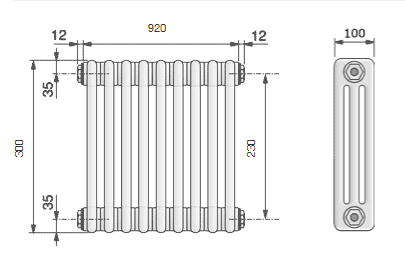 Радиаторы поставляются в собранном виде и оснащены 4-мя резьбовыми заглушками для подающего и обратного трубопровода, а также для микровоздушника и опорожнения. Все грани округлены с Rmin = 2 мм.