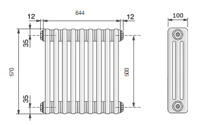 Радиаторы поставляются в собранном виде и оснащены 4-мя резьбовыми заглушками для подающего и обратного трубопровода, а также для микровоздушника и опорожнения. Все грани округлены с Rmin = 2 мм.