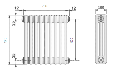Радиаторы поставляются в собранном виде и оснащены 4-мя резьбовыми заглушками для подающего и обратного трубопровода, а также для микровоздушника и опорожнения. Все грани округлены с Rmin = 2 мм.