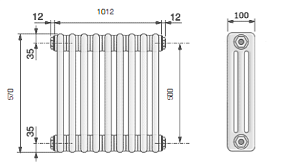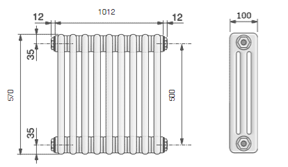 Радиаторы поставляются в собранном виде и оснащены 4-мя резьбовыми заглушками для подающего и обратного трубопровода, а также для микровоздушника и опорожнения. Все грани округлены с Rmin = 2 мм.