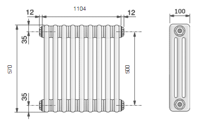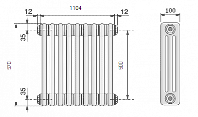 Радиаторы поставляются в собранном виде и оснащены 4-мя резьбовыми заглушками для подающего и обратного трубопровода, а также для микровоздушника и опорожнения. Все грани округлены с Rmin = 2 мм.