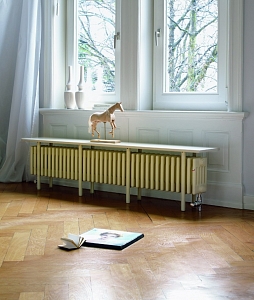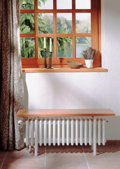 Скамейка на дачной террасе – это лишь одно из возможных применений радиатора Zehnder Charleston Bank. Этот прибор может служить и удобной теплой скамьей (например для переобувания обуви в прихожей), и полкой для вещей.